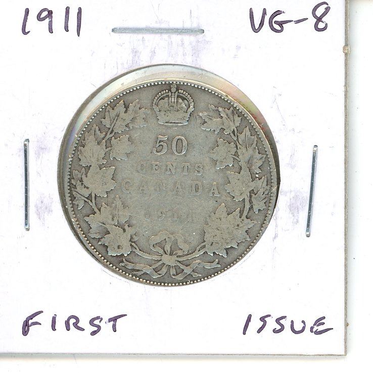1911 Canadian Silver 50 Cents. First issue of King George V. VG-8.