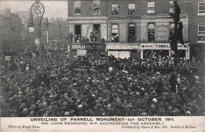 Rare souvenir pamphlet of the unveiling of the Parnell monument in Dublin on the 1 October 1911, with illustrations and procession timetable, 32 pp. Memorial photograph of Parnell with black card backing. Photographic postcard of John Redmond addressing the crowd at the unveiling of the Parnell monument. Also a pamphlet, William Field MP, a biography of character and study printed by The Meat Trades' Journal, London. (4 items)