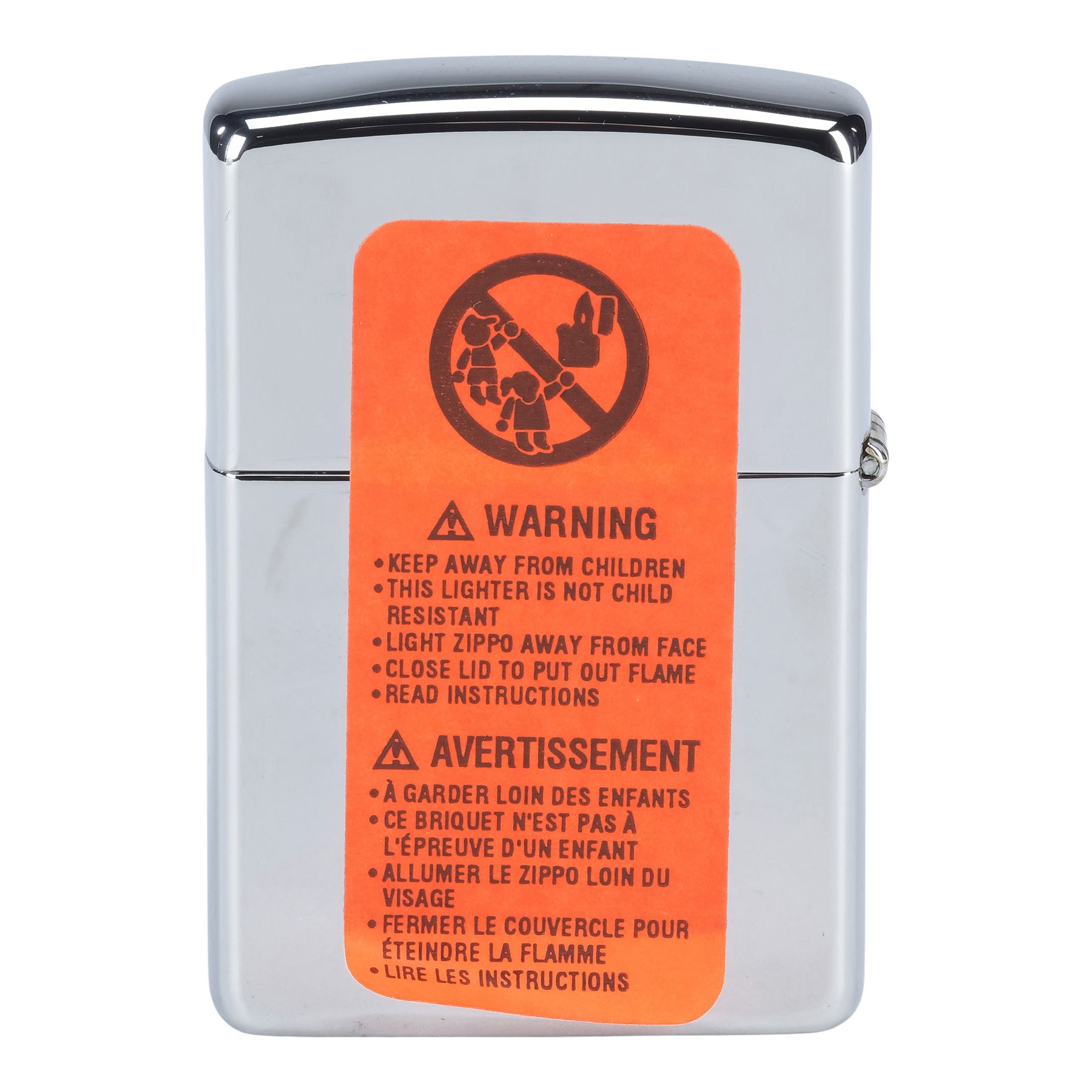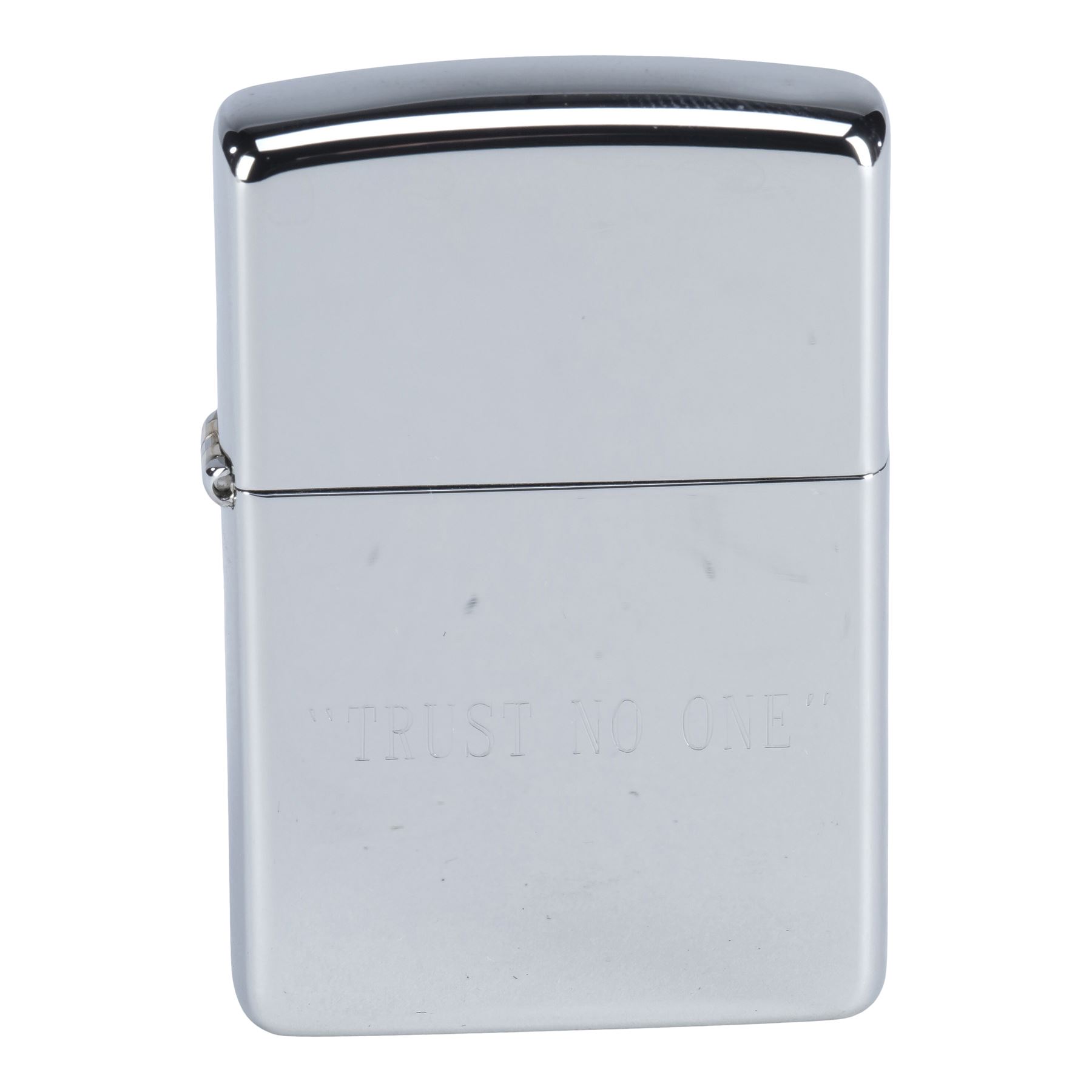Acquired for production but ultimately unseen onscreen, this brass flip-top Zippo lighter is engraved "Trust No One" on the front and applied with a warning label on the reverse. Also included is a Zippo Guarantee sheet and box with serial number "065332002504." The lighter exhibits minor scratching and smudging from handling, and its current functionality remains untested. Dimensions: 2" x 3.25" x 0.75" (5 cm x 8 cm x 2 cm)