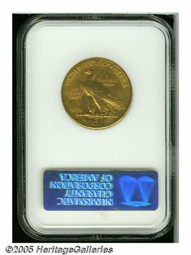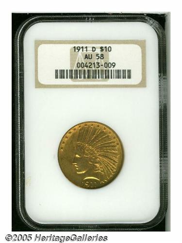 <B>1911-D<$10> AU58 NGC.</B></I> The 1911-D has the lowest mintage of any regular issue Indian Head eagle. It is generally seen only in VF and XF condition, and average quality Uncirculated examples are rare. The AU58 specimen offered in this lot displays bright orange-gold surfaces with nice residual luster and sharply impressed design elements. A few minute contact marks are noted on the Indian's cheek.<BR><I>From The Dr. Theodore Almquist Collection.</B></I>