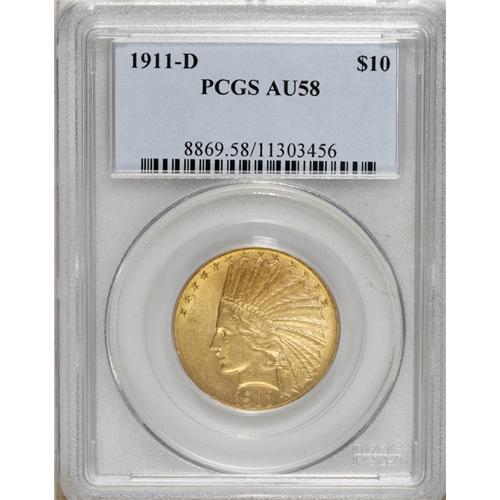 <B>1911-D $10 AU58 PCGS.</B></I> Although it will never the challenge the 1933 as a series key, the 1911-D does have the lowest mintage among the Motto issues. Just 30,100 pieces were struck. This piece has the luster of a higher grade, but the cheek and neck display moderate marks.<BR><BR><b>Shipping:</b> Coins & Currency (<a target="_blank" href="http://www.heritageauctions.com/common/shipping.php">view shipping information</a>)
