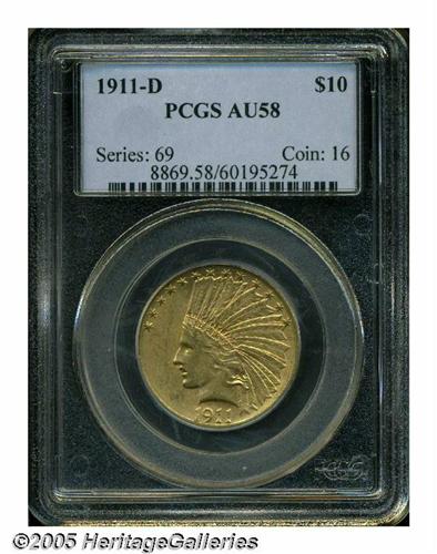 <B>1911-D<$10> AU58 PCGS.</B></I> An elusive issue both from an overall rarity and condition rarity standpoint. The lustrous, matte-like surfaces display little actual wear, but show a few scattered abrasions on the reverse.