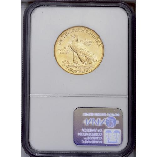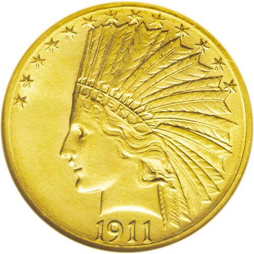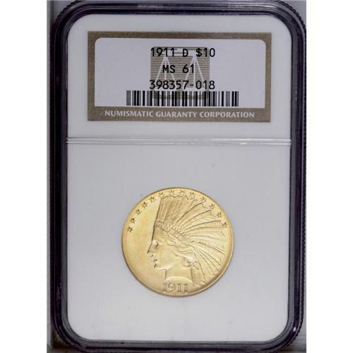 <B>1911-D<$10> MS61 NGC.</B></I> A key date in the Indian Eagle series, the 1911-D is difficult to find in any grade, and especially so in Mint State, with only 30,100 pieces produced. It is also one of the rarest 20th century gold issues. This is an extremely high-end coin for the grade, with soft luster, beautiful apricot-gold surfaces, and a mattelike texture. There are remarkably few abrasions for the grade, and the devices are crisply struck in all areas save for the eagle's shoulder on the reverse. An aesthetically pleasing and attractive example of this elusive issue. Census: 36 in 61, 56 finer (7/06).