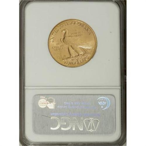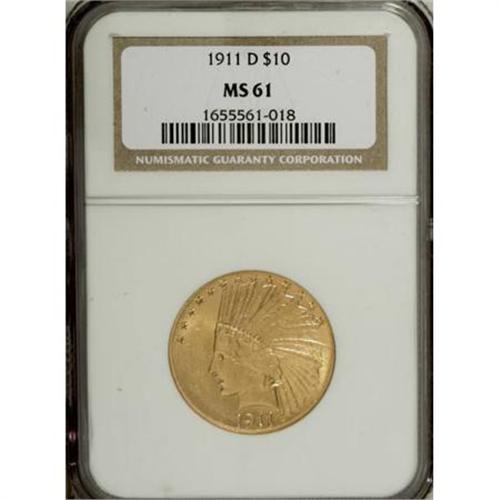 <B>1911-D $10 MS61 NGC.</B></I> Aside from the 1907 patterns that open the series, the 1911-D is the lowest mintage Indian eagle. It is also much scarcer than its closest low mintage competitor, the 1908 No Motto. This is a lustrous straw-gold piece with generally smooth fields and a few moderate marks on the portrait.<BR><BR><B>Coin Engraver:</B> Augustus Saint-Gaudens<BR><BR><b>Shipping:</b> Coins & Currency (<a target="_blank" href="http://www.heritageauctions.com/common/shipping.php">view shipping information</a>\)