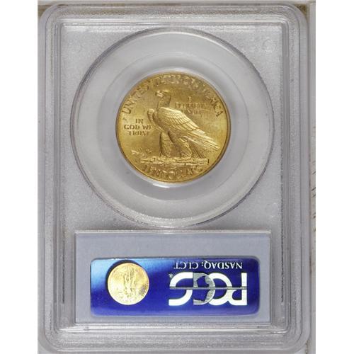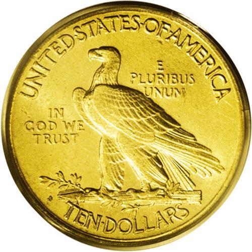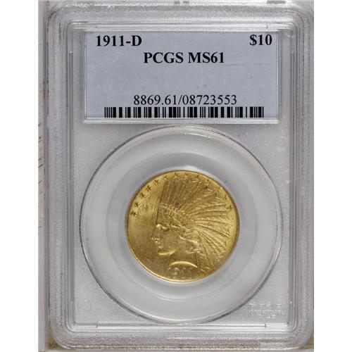 <B>1911-D<$10> MS61 PCGS.</B></I> It is not only the 1911-D quarter eagle that is the key to its series. Although sometimes not as well recognized, the 1911-D eagle is also key to the Indian eagle collection. The present example has appealing yellow-gold surfaces, but there is a bit of field haze on each side. Under a loupe, numerous abrasions appear on Liberty's cheek and temple, and a couple of light pinscratches show in the reverse field near the motto. Population: 21 in 61, 76 finer (9/06).