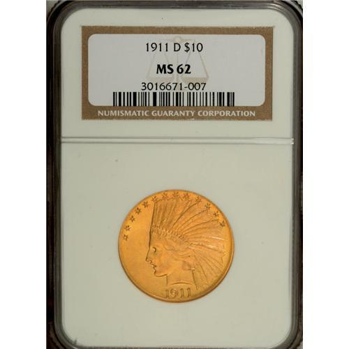 <B>1911-D $10 MS62 NGC.</B></I> This is an extremely important opportunity for the specialist collector to acquire a Mint State example of this elusive date. The 1911-D is rare in all grades, as one would expect from an issue with a mintage of 30,100 coins, the lowest production total in the entire Indian eagle series save for the two 1907 With Periods varieties. Both sides are fully lustrous with matte-like tangerine-gold surfaces and sharp design features. The population totals undoubtedly include a certain number of resubmissions.<BR><BR><b>Shipping:</b> Coin/Currency (<a target="_blank" href="http://www.heritageauctions.com/common/shipping.php">view shipping information</a>)