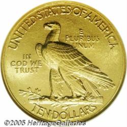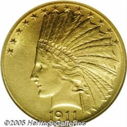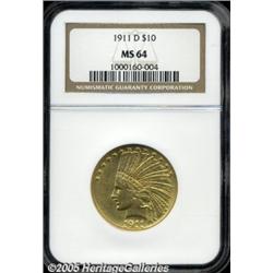 <B>1911-D $10 MS64 NGC.</B></I> Perhaps the most recognizable combination of date and mintmark in the various series of Indian U.S. gold, being a key issue both as a Quarter Eagle and Half Eagle, in addition to its notoriety as an Eagle. Just 30,100 pieces were originally struck and a large majority did manage to circulate, thus creating one of the outstanding condition rarities in the series of Indian Tens. This high grade specimen exhibits bright, satiny luster with a uniform overlay of orange patina. A few trivial blemishes are noticed on the obverse portrait, but these are only discernible after close examination. Other than a few mass-melted rarities among 20th century gold, this Choice Mint State 1911-D certainly ranks among the most valuable and prestigious gold coins from the past 100 years. Population: 14 in 64, 0 finer (2/05).
