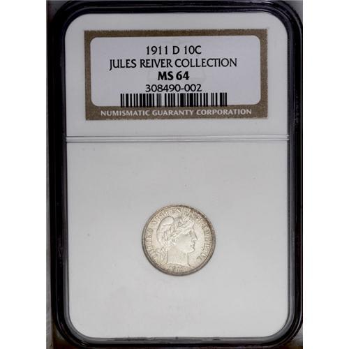 1911-D 10C MS64 NGC. A satiny Mint State example with 1911-D[10C] MS64 NGC.