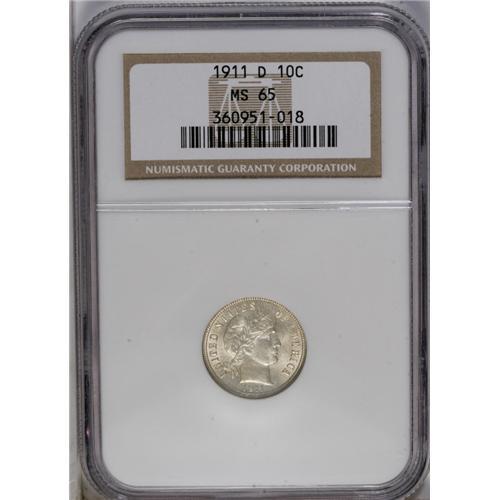 <B>1911-D<10C> MS65 NGC.</B></I> Gentle gray-gold toning drapes this lustrous and nicely struck Gem. Beautifully unabraded, and worthy of the advanced specialized holding. Census: 37 in 65, 16 finer (6/06).