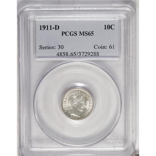 <B>1911-D 10C MS65 PCGS.</B></I> Bright silver-gray surfaces exhibit frosty luster and speckles of light tan-gold color, along with well impressed design features. A couple of wispy slide marks on the cheek are barely noticeable. Overall, quite a pleasing Barber dime that is sure to delight the new owner.<BR><BR><b>Shipping:</b> Coin/Currency (<a target="_blank" href="http://www.heritageauctions.com/common/shipping.php">view shipping information</a>)