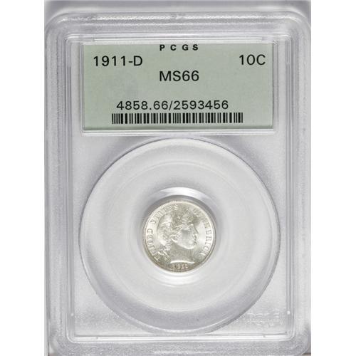<B>1911-D 10C MS66 PCGS.</B></I> This lustrous Premium Gem is boldly struck, and gently toned pearl-gray. The only visible imperfection is a toning fleck above the O in ONE. Housed in a green label holder. Population: 28 in 66, 6 finer (10/06).<BR><BR><b>Shipping:</b> Coin/Currency (<a target="_blank" href="http://www.heritageauctions.com/common/shipping.php">view shipping information</a>)