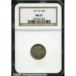 <B>1911-D 10C MS67 NGC.</B></I> A lovely toned example of this date, the obverse sports light lemon-yellow and green hues while the reverse shows more streaky gold with a splash of teal blue on the wreath. Sharply struck throughout, and highly appealing for the date collector. Although not a particularly rare date, in this lofty grade just a handful are known, and none have been graded higher by either grading service. A great coin for the date collector to obtain. Population: 7 in 67, 0 finer (2/05).
