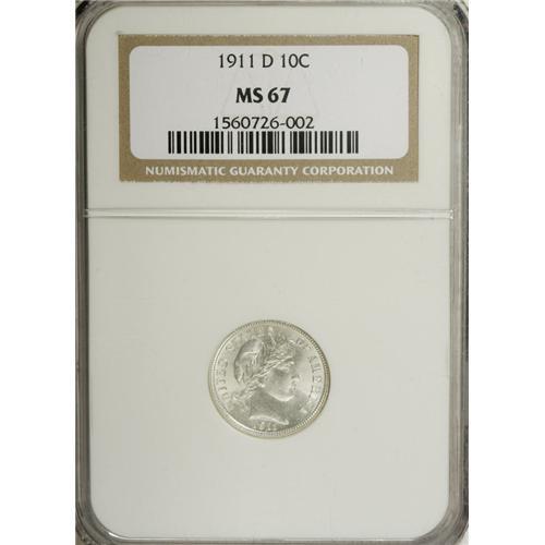 <B>1911-D 10C MS67 NGC.</B></I> A stone-white Superb Gem with blazing luster and unperturbed preservation. The strike is exemplary, and the eye appeal is exceptional. A rim die break is noted between 11:30 and 12:30. No pieces have been certified finer by either NGC or PCGS. Census: 7 in 67, 0 finer (4/07).<BR><BR><b>Shipping:</b> Coins & Currency (<a target="_blank" href="http://www.heritageauctions.com/common/shipping.php">view shipping information</a>)