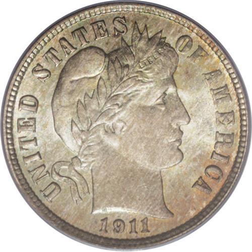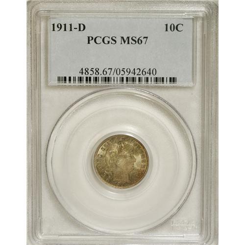 <B>1911-D 10C MS67 PCGS.</B></I> This shining and exquisitely preserved piece hails from the year in which the cent joined silver and gold denominations for production at Denver. Solidly struck with surfaces awash in emerald and mustard-gold patina on the obverse and similar, deeper colors on the reverse. Population: 6 in 67, 0 finer (4/07).<BR><BR><b>Shipping:</b> Coins & Currency (<a target="_blank" href="http://www.heritageauctions.com/common/shipping.php">view shipping information</a>)