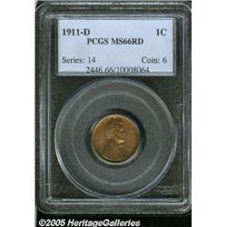 <B>1911-D 1C MS66 Red PCGS.</B></I> Well defined, the surfaces show even red mint luster over both sides. The luster is accented with lime-green, brick-red, pinkish-rose, and mauve mixed with honey overall. A premium example of this early mintmarked Lincoln. Population: 14 in 66, 1 finer (1/05).
