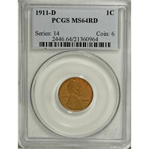 <B>1911-D 1C MS64 Red PCGS.</B></I> PCGS Population (228/142). NGC Census: (81/29). Mintage: 12,672,000. Numismedia Wsl. Price for NGC/PCGS coin in MS64: $500. (#2446)<BR><BR><B>Coin Engraver:</B> Victor D. Brenner<BR><BR><b>Shipping:</b> Coins & Currency (<a target="_blank" href="http://www.heritageauctions.com/common/shipping.php">view shipping information</a>)