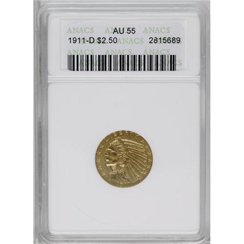 <B>1911-D<$2 1/2> AU55 ANACS.</B></I> A boldly struck example with an especially strong mintmark, and highly desirable as such. The surfaces have lovely medium yellow color with orange tendencies and nearly full luster. <BR><BR><B>Important notice:</B> Heritage usually auctions material at the rate of 200-250 lots per hour. On some occasions eBay Live bid software or the Internet may not be able to keep up with the pace of the auction. We recommend placing a realistic absentee bid now as insurance to avoid disappointment. Occasionally the auctioneer may eliminate or reject an eBay Live bid, and the auctioneer may also reopen a lot after the close of the eBay live bidding (usually because we missed an audience bid), and may reject your bid even if it shows you as the winning bidder. By bidding via eBay Live, you agree that Heritage may award the lot to another bidder at its sole discretion under the circumstances described above or any other reasonable circumstances. Since eBay bids are not shown to us until we open the lot on the floor, we treat those bids just like floor bids. In most cases the floor responds before the eBay bid is presented to us, due to Internet lag time, so for consistency we have made it a policy that floor bids are always considered first over tie eBay live bids. Also please note that all Heritage lots purchased through eBay Live carry a 20% Buyer's Premium. Please make sure you read the Terms and Conditions before you bid. This lot is being auctioned in conjunction with a live floor auction by Heritage Galleries & Auctioneers. All final auction and invoice information will be supplied by Heritage Galleries & Auctioneers, and all other information should be considered preliminary. Lot:2482 <BR><BR><B>Winning Notification and Billing:</B> After the FINAL session in this auction is complete, Heritage will send e-mail and snail mail invoices. This process normally takes several days. All final auction and invoice information will be supplied by Heritage Galleries & Auctioneers, and all other information should be considered preliminary. <BR><BR>This auction will be conducted on a live auction floor and over the Internet through eBay Live. If you choose to place an absentee bid, please take a moment to <font color='#0000ff'><u><a href='http://pages.ebay.com/liveauctions/help/before/laabsentee.html'>learn how eBay Live absentee bidding works</a></u></font><font color='#000000'>