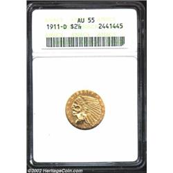 1911-D $2 1/2 AU55 ANACS. Light honey-gold patina. The fields have a few wispy slide marks, and the.