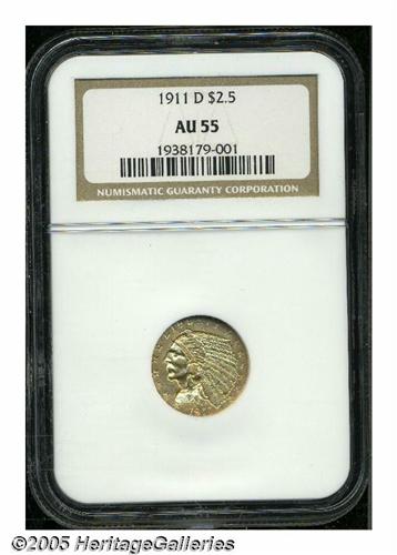 <B>1911-D<$2 1/2> AU55 NGC.</B></I> An attractive, minimally worn key issue, with a reasonably well defined mintmark. There are a few small marks concentrated on the reverse.