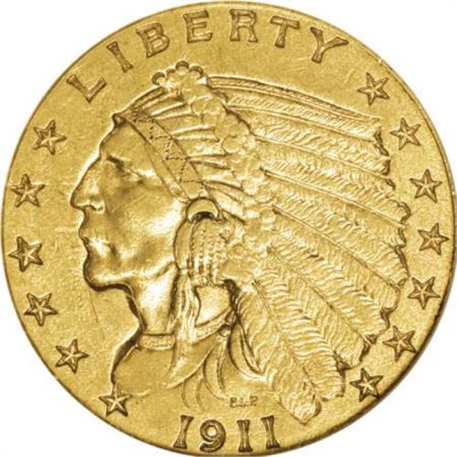<B>1911-D $2 1/2 AU55 NGC.</B></I> The mintmark is well outlined if not bold on this key-date example, with further proof coming in the form of the wire rim always seen on the right obverse rim. This greenish-gold example offers delightful luster, with scant wear limited to the highpoints and only a couple of tiny abrasions.<BR><BR><B>Coin Engraver:</B> Bela Lyon Pratt<BR><BR><b>Shipping:</b> Coins & Currency (<a target="_blank" href="http://www.heritageauctions.com/common/shipping.php">view shipping information</a>)