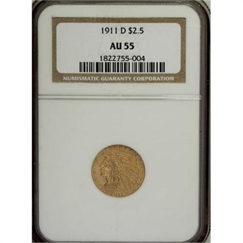 <B>1911-D $2 1/2 AU55 NGC.</B></I> A picture-perfect Choice AU specimen, with beautiful gold coloration, pleasing luster, and relatively mark-free surfaces. A touch of rub on the high points is the grade-limiting factor for this boldly impressed key date quarter eagle, although the mintmark is notably weak, as sometimes seen on this issue. Given the significant price increase between AU55 and MS60 examples, this piece is sure to elicit attention when it crosses the auction block. <BR><BR><B>Coin Engraver:</B> Bela Lyon Pratt<BR><BR><b>Shipping:</b> Coins & Currency (<a target="_blank" href="http://www.heritageauctions.com/common/shipping.php">view shipping information</a>)