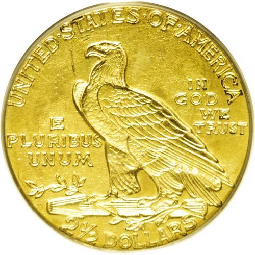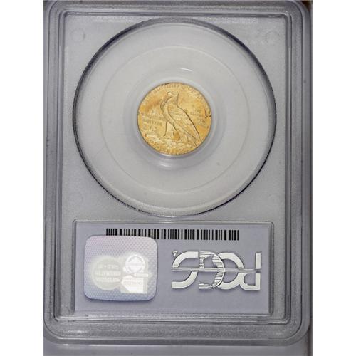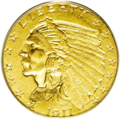 <B>1911-D<$2 1/2> AU55 PCGS.</B></I> A spot of wear on the Indian's cheekbone prevents this coin from being Mint State. The predominantly orange-gold surfaces host spots of other colors, including green-gold on the obverse and red on the reverse. Boldly struck and lustrous, with a shallow abrasion noted to the left of the eagle's beak.