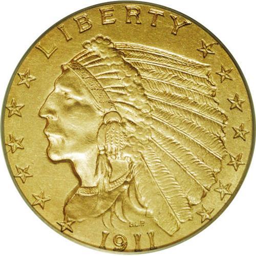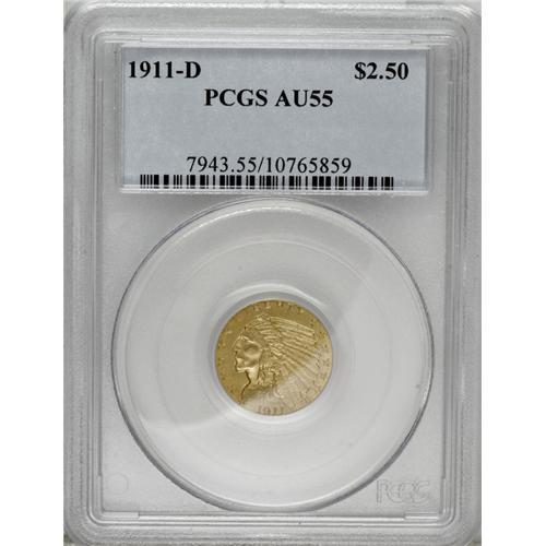 <B>1911-D $2 1/2 AU55 PCGS.</B></I> An appealing Choice AU coin that likely changed hands at the Mint State level before the advent of certified grading, as only the faintest evidence of rub is visible on the coin's highpoints, and much luster remains. The color alternates appealingly between deep amber and lighter khaki-gold, and the mintmark is bold, despite its partial obscuration by the PCGS holder.<BR><BR><b>Shipping:</b> Coins & Currency (<a target="_blank" href="http://www.heritageauctions.com/common/shipping.php">view shipping information</a>)