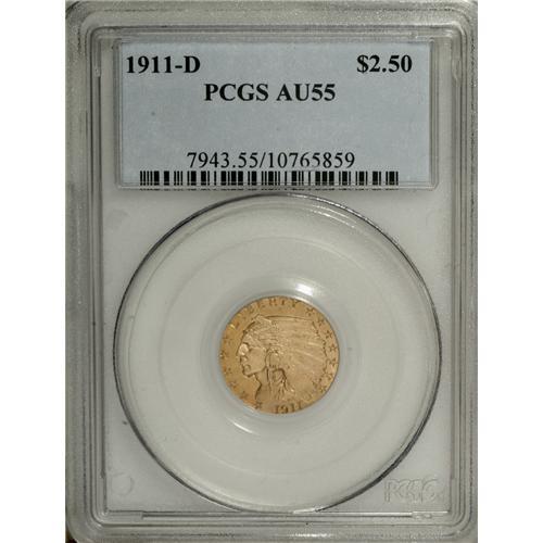 <B>1911-D $2 1/2 AU55 PCGS.</B></I> An appealing Choice AU coin that likely changed hands at the Mint State level before the advent of certified grading, as only the faintest evidence of rub is visible on the coin's highpoints, and much luster remains. The color alternates appealingly between deep amber and lighter khaki-gold, and the mintmark is bold, despite being partial obscured by the PCGS holder.<BR><BR><b>Shipping:</b> Coins & Currency (<a target="_blank" href="http://www.heritageauctions.com/common/shipping.php">view shipping information</a>)