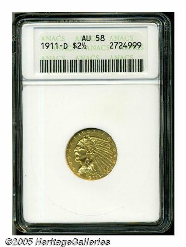 <B>1911-D<$2 1/2> AU58 ANACS.</B></I> An important offering for the circulated date collector, this minimally rubbed example displays original yellow-gold color. Both sides are well detailed in virtually all areas with no singularly mentionable abrasions. The D mintmark is typically defined.