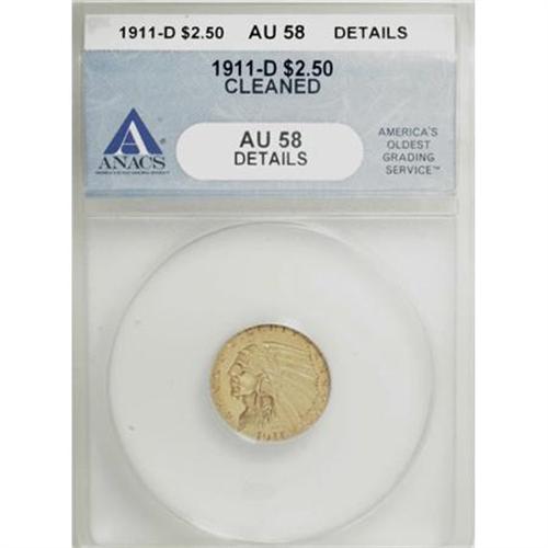 <B>1911-D $2 1/2 --Cleaned--ANACS. AU58 Details.</B></I> The mintmark is sharp on this key date quarter eagle, and the devices are splendidly detailed. The cheekbone may have a trace of wear, but it is difficult to tell since the surfaces are somewhat glossy and luminous from a cleaning. The absence of marks aids the eye appeal.<BR><BR><B>Coin Engraver:</B> Bela Lyon Pratt<BR><BR><b>Shipping:</b> Coins & Currency (<a target="_blank" href="http://www.heritageauctions.com/common/shipping.php">view shipping information</a>)