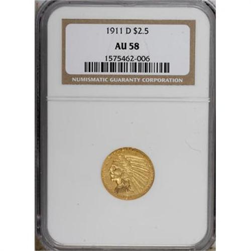 <B>1911-D $2 1/2 AU58 NGC.</B></I> Nearly full luster is exhibited on this near-Mint coin with pale yellow-gold surfaces. This is a highly collectible example of the key-date Indian quarter eagle. Examples at this grade level are always in demand, as they generally fit nicely in an otherwise Mint State set of these coins.<BR><BR><b>Shipping:</b> Coins & Currency (<a target="_blank" href="http://www.heritageauctions.com/common/shipping.php">view shipping information</a>)