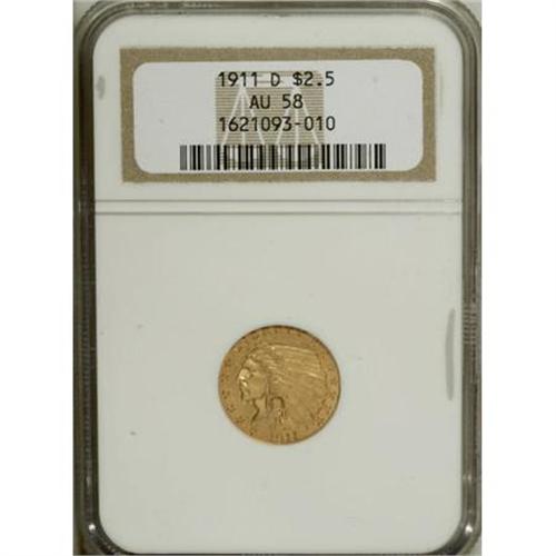 <B>1911-D $2 1/2 AU58 NGC.</B></I> The 1911-D Indian Head quarter eagle, half eagle, and eagle are all key coins within their respective series, and yet the Saint-Gaudens 1911-D double eagle is a fairly common issue with a considerable mintage. It is a puzzlement to the present cataloger why this should be so, but the best explanation appears to be that there was simply little <I>need </B></I>for the smaller denominations after several years of abundant emissions. This attractive near-Mint State specimen offers few visible signs of post-strike contact, just light rub on the lustrous orange-gold and hazel-tinged surfaces.<BR><BR><b>Shipping:</b> Coins & Currency (<a target="_blank" href="http://www.heritageauctions.com/common/shipping.php">view shipping information</a>)