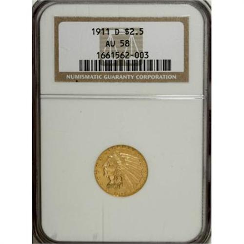 <B>1911-D $2 1/2 AU58 NGC.</B></I> Writing about the 1911-D quarter eagle, Paul Taglione says in his <I>A Reference to United States Federal Gold Coinage</B></I>: "This coin is probably scarce in any grade but all available evidence tends to confirm the thesis that the 1911-D was actively saved within 15 years of issuance. However, most examples were apparently rescued from circulation as the issue is very scarce in strict Mint State quality." This AU58 example retains considerable luster on yellow-gold surfaces, and strong detail is visible on the design elements, except for the eagle's shoulder. Some hair-thin marks are noted in the upper reverse field.<BR><BR><B>Coin Engraver:</B> Bela Lyon Pratt<BR><BR><b>Shipping:</b> Coins & Currency (<a target="_blank" href="http://www.heritageauctions.com/common/shipping.php">view shipping information</a>\)