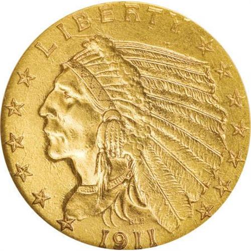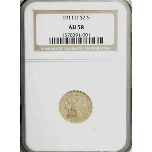 <B>1911-D $2 1/2 AU58 NGC.</B></I> Slight friction on the cheekbone and headdress confirms momentary circulation, but this key date example provides considerable shimmery luster. The mintmark has low relief but is consistently clear. Field abrasions are minimal for the Borderline Uncirculated level.<BR><I>From The Parker Lee III Collection.</B></I><BR><BR><B>Coin Engraver:</B> Bela Lyon Pratt<BR><BR><b>Shipping:</b> Coins & Currency (<a target="_blank" href="http://www.heritageauctions.com/common/shipping.php">view shipping information</a>)