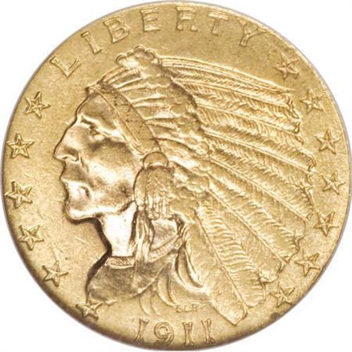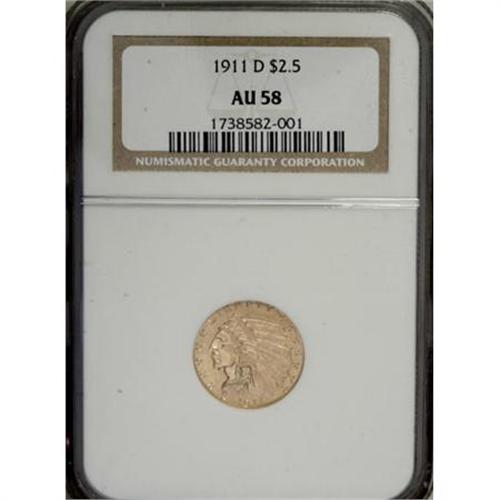 <B>1911-D $2 1/2 AU58 NGC.</B></I> Well defined overall, the mintmark is weakly impressed but fully visible. The surfaces are bright and satiny with a slightly granular texture. The '11-D is the stopper for most collectors of this short series, and if a collector can get past this issue the remainder of the set is a breeze.<BR><BR><B>Coin Engraver:</B> Bela Lyon Pratt<BR><BR><b>Shipping:</b> Coins & Currency (<a target="_blank" href="http://www.heritageauctions.com/common/shipping.php">view shipping information</a>)