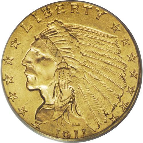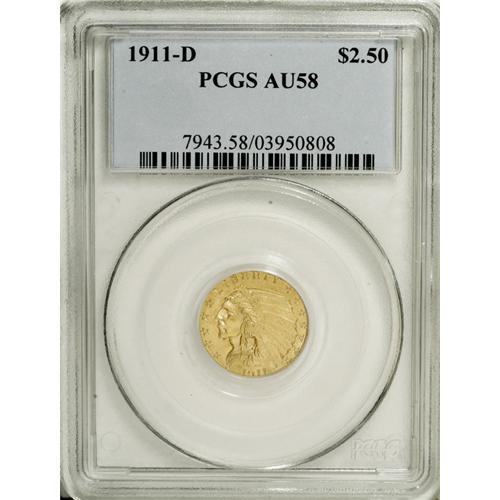 <B>1911-D $2 1/2 AU58 PCGS.</B></I> An ideal grade for most collectors of Indian quarter eagles, this impressive near-Mint example has brilliant yellow-gold luster with sharp design details. Just a trace of wear is evident on the Indian's cheek and the top of the eagle's feather. For the prospective collector, why not start with this key-date issue and the rest are easy.<BR><BR><b>Shipping:</b> Coins & Currency (<a target="_blank" href="http://www.heritageauctions.com/common/shipping.php">view shipping information</a>)