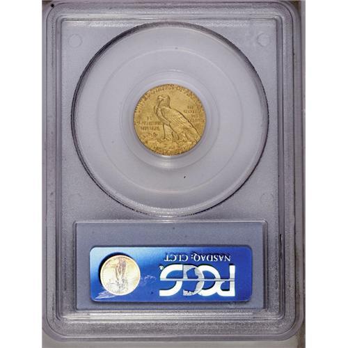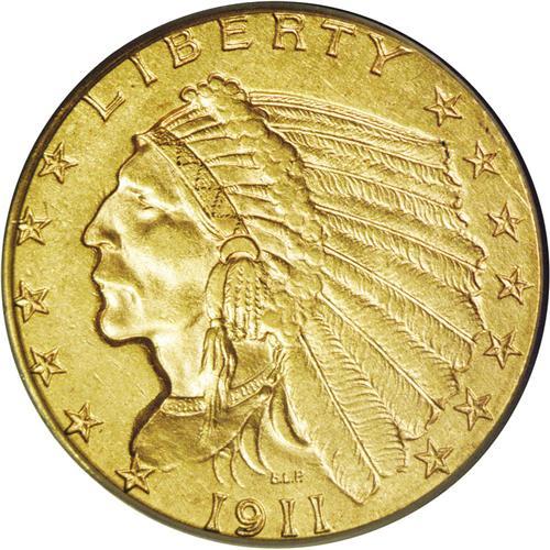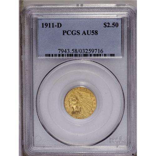 <B>1911-D<$2 1/2> AU58 PCGS.</B></I> Mike Fuljenz and Doug Winter, in a <I>Collector's Guide to Indian Head Quarter Eagles,</B></I> outline the factors that make the 1911-D the most desirable single coin in the series. First, it has the lowest mintage (55,600 pieces) by a large margin, and is the only issue whose mintage is below 100,000. Second, it is one of just three non-Philadelphia issues of this design. Third, it is the rarest Indian Head quarter eagle. The high-end AU specimen offered here displays attractive apricot-gold patina and nicely defined motifs. A few unobtrusive light marks are scattered over each side.