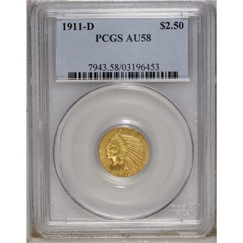 <B>1911-D $2 1/2 AU58 PCGS.</B></I> Several examples of this highly desirable key-date quarter eagle are offered in the present sale, as in most of our sales. Pale green-gold color enhances the satiny luster of this piece, with only a trace of wear on the highest points of the design.<BR><BR><b>Shipping:</b> Coin/Currency (<a target="_blank" href="http://www.heritageauctions.com/common/shipping.php">view shipping information</a>)