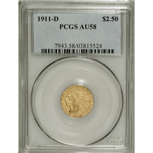 <B>1911-D $2 1/2 AU58 PCGS.</B></I> The apricot-gold surfaces on this key-date piece show relatively few abrasions even under a loupe, and radiant luster emanates from the appealing surfaces. The little actual wear noted centers more on the eagle's forward wingtip than on the Indian's cheek. So close to Mint State.<BR><BR><b>Shipping:</b> Coins & Currency (<a target="_blank" href="http://www.heritageauctions.com/common/shipping.php">view shipping information</a>)