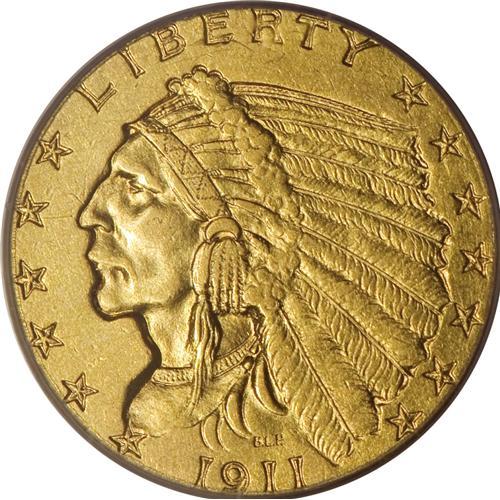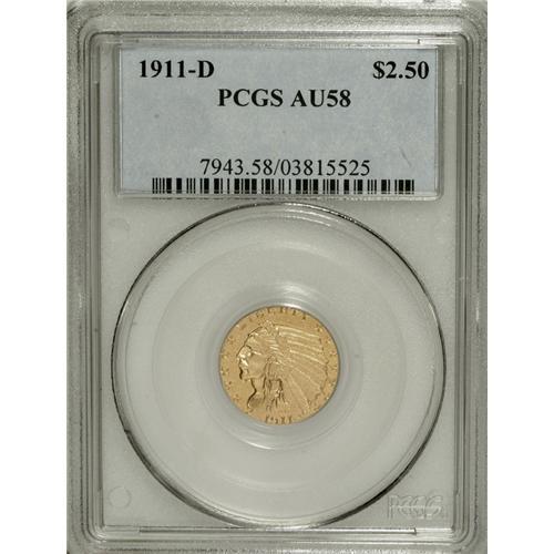 <B>1911-D $2 1/2 AU58 PCGS.</B></I> The large emissions of eagles and half eagles from the Denver Mint in the two years prior to 1911 are likely the cause of the small production of this key-date issue, manufactured to the extent of only 55,600 pieces. The mintmark is pleasingly bold--a feature that many collectors seek in their purchasing decision--and only a hair's breadth of wear separates this piece from Mint State. The few light field abrasions seen over the lustrous khaki-gold surfaces are the result of a short stint in circulation that was probably numbered in the days rather than weeks.<BR><BR><b>Shipping:</b> Coins & Currency (<a target="_blank" href="http://www.heritageauctions.com/common/shipping.php">view shipping information</a>)