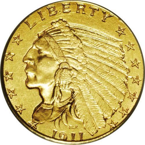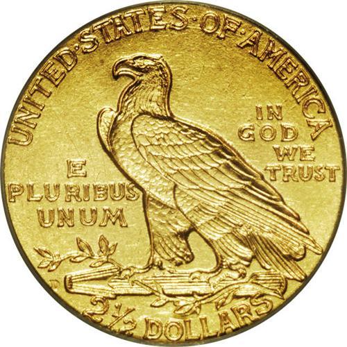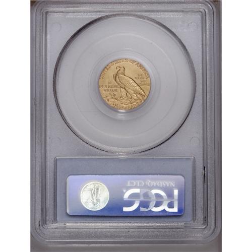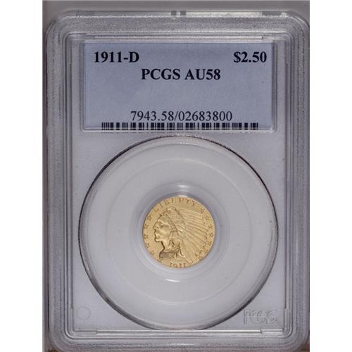 <B>1911-D $2 1/2 AU58 PCGS.</B></I> The most important feature of this example is its bold and complete mintmark. Most examples of this issue have a weak, or in some cases invisible, mintmark. Sharply struck with light yellow luster. A remarkable near-mint example.