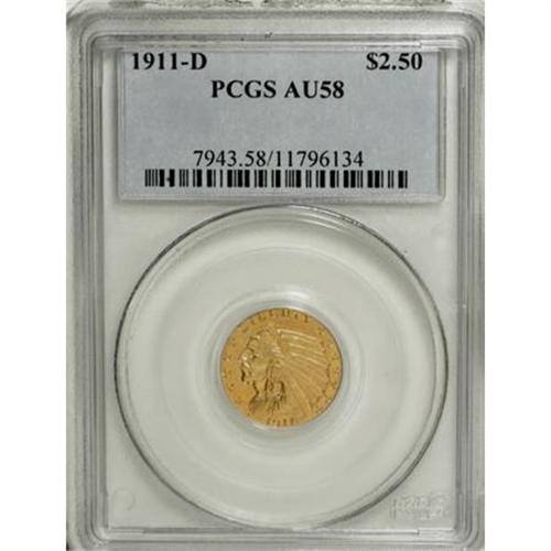 <B>1911-D $2 1/2 AU58 PCGS.</B></I> By definition, AU58 coins are coins that would likely grade MS63 or finer except for the slightest highpoint rub. Coins in the lower Mint State grades, also by definition, have distractions of some sort, making this key-date 1911-D in AU58 an attractive alternative, both economically and aesthetically, to an MS60-MS62 piece. <BR> In practice, this coin offers mint luster that is essentially full, with trivial wear that appears as a slight color change on the highpoints of the Indian's brow and cheek and the eagle's upper wing. But the piece is nearly mark-free, with lush apricot-gold surfaces, a bold mintmark, and premium appeal.<BR><BR><B>Coin Engraver:</B> Bela Lyon Pratt<BR><BR><b>Shipping:</b> Coins & Currency (<a target="_blank" href="http://www.heritageauctions.com/common/shipping.php">view shipping information</a>\)