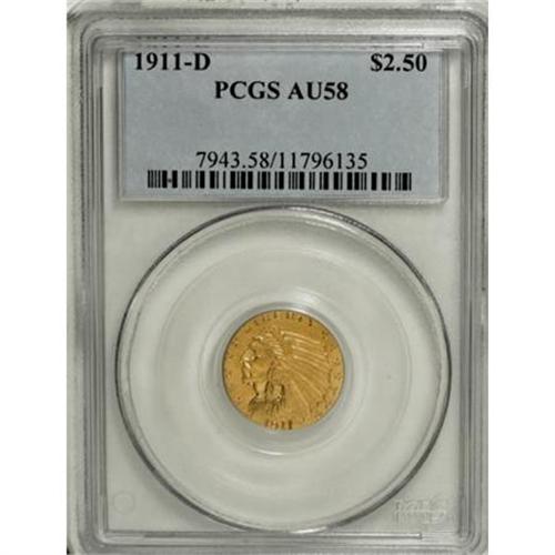 <B>1911-D $2 1/2 AU58 PCGS.</B></I> The mintmark is complete and bold, and every other detail is similarly sharp, with only a trace of rub on the satiny honey-gold surfaces. Faint splashes of orange toning on each side are only evident upon close inspection. Part of an impressive lineup of 1911-D quarter eagles in the present sale, providing a range of quality for all different collecting budgets.<BR><BR><B>Coin Engraver:</B> Bela Lyon Pratt<BR><BR><b>Shipping:</b> Coins & Currency (<a target="_blank" href="http://www.heritageauctions.com/common/shipping.php">view shipping information</a>\)