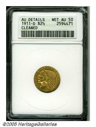 <B>1911-D<$2 1/2>--Cleaned--ANACS. AU Details, Net AU50.</B></I> The yellow-gold surfaces are just a little muted, the result of having been cleaned at one time. Minimally marked with good detail, an affordable example of this popular key.