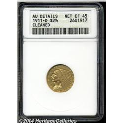 <B>1911-D<$2 1/2>--Cleaned--ANACS. AU Details, Net XF45.</B></I> The central reverse exhibits faint horizontal hairlines, and the obverse has a mildly grainy appearance. Well known as the key date to the series. <BR><BR><B>Important notice:</B> Heritage usually auctions material at the rate of 200-250 lots per hour. On some occasions eBay Live bid software or the Internet may not be able to keep up with the pace of the auction. We recommend placing a realistic absentee bid now as insurance to avoid disappointment. Occasionally the auctioneer may eliminate or reject an eBay Live bid, and the auctioneer may also reopen a lot after the close of the eBay live bidding (usually because we missed an audience bid), and may reject your bid even if it shows you as the winning bidder. By bidding via eBay Live, you agree that Heritage may award the lot to another bidder at its sole discretion under the circumstances described above or any other reasonable circumstances. Since eBay bids are not shown to us until we open the lot on the floor, we treat those bids just like floor bids. In most cases the floor responds before the eBay bid is presented to us, due to Internet lag time, so for consistency we have made it a policy that floor bids are always considered first over tie eBay live bids. Also please note that all Heritage lots purchased through eBay Live carry a 20% Buyer's Premium. Please make sure you read the Terms and Conditions before you bid.