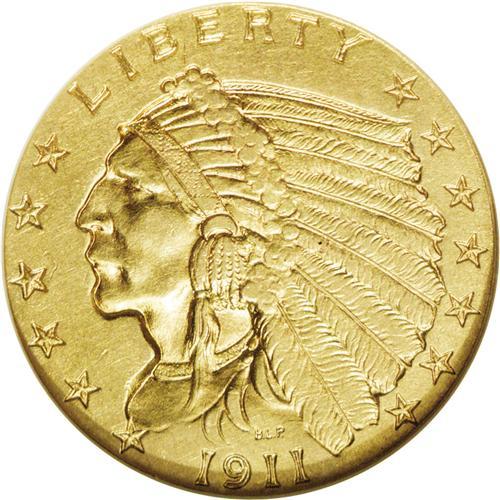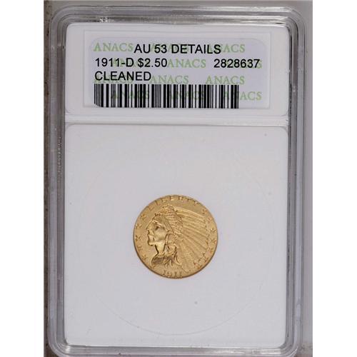 <B>1911-D<$2 1/2>--Cleaned--ANACS. AU53 Details.</B></I> Well struck with satiny, smooth, pleasing honey-gold surfaces. Unmarked with barely a trace of wear on either side. A few wispy hairlines in the reverse fields constitute the only faint evidence of improper cleaning. The key date to the Indian quarter eagle series.