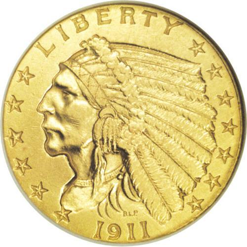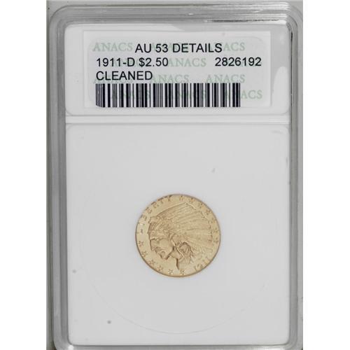 <B>1911-D<$2 1/2>--Cleaned--ANACS. AU53 Details.</B></I> The devices are sharply defined and the mintmark is bold. Luster clings to the recessed motifs. The dull straw-gold fields are granular and hairlined, and display unnatural satin luster. Nonetheless, this piece would be the standout in many collections of this popular gold series.