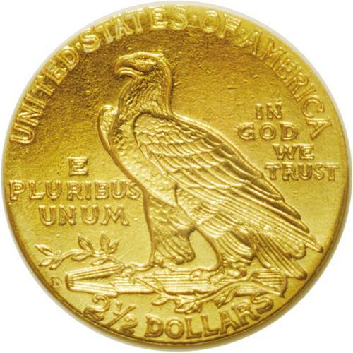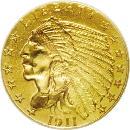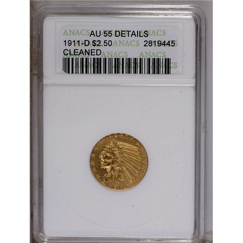 <B>1911-D<$2 1/2>--Cleaned--ANACS. AU55 Details.</B></I> Peach-gold surfaces display some unnatural brightness from the cleaning, as well as wispy hairlines. Sharp definition is noted on the design elements, except for softness on the eagle's shoulder. A couple of minor abrasions are seen on the Indian's cheek. the mintmark is relatively strong for the issue. The undisputed key to the Indian quarter eagle series.