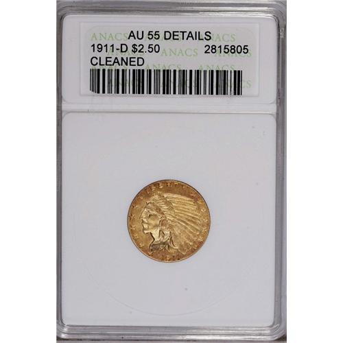 <B>1911-D<$2 1/2>--Cleaned--ANACS. AU55 Details.</B></I> Good detail, save for the mintmark, which is often softly struck on this popular date. Each side presents a deep copper-gold appearance. The underlying surfaces have been lightly cleaned at one time. <BR><BR><B>Important notice:</B> Heritage usually auctions material at the rate of 200-250 lots per hour. On some occasions eBay Live bid software or the Internet may not be able to keep up with the pace of the auction. We recommend placing a realistic absentee bid now as insurance to avoid disappointment. Occasionally the auctioneer may eliminate or reject an eBay Live bid, and the auctioneer may also reopen a lot after the close of the eBay live bidding (usually because we missed an audience bid), and may reject your bid even if it shows you as the winning bidder. By bidding via eBay Live, you agree that Heritage may award the lot to another bidder at its sole discretion under the circumstances described above or any other reasonable circumstances. Since eBay bids are not shown to us until we open the lot on the floor, we treat those bids just like floor bids. In most cases the floor responds before the eBay bid is presented to us, due to Internet lag time, so for consistency we have made it a policy that floor bids are always considered first over tie eBay live bids. Also please note that all Heritage lots purchased through eBay Live carry a 20% Buyer's Premium. Please make sure you read the Terms and Conditions before you bid. This lot is being auctioned in conjunction with a live floor auction by Heritage Galleries & Auctioneers. All final auction and invoice information will be supplied by Heritage Galleries & Auctioneers, and all other information should be considered preliminary. Lot:2481 <BR><BR><B>Winning Notification and Billing:</B> After the FINAL session in this auction is complete, Heritage will send e-mail and snail mail invoices. This process normally takes several days. All final auction and invoice information will be supplied by Heritage Galleries & Auctioneers, and all other information should be considered preliminary. <BR><BR>This auction will be conducted on a live auction floor and over the Internet through eBay Live. If you choose to place an absentee bid, please take a moment to <font color='#0000ff'><u><a href='http://pages.ebay.com/liveauctions/help/before/laabsentee.html'>learn how eBay Live absentee bidding works</a></u></font><font color='#000000'>