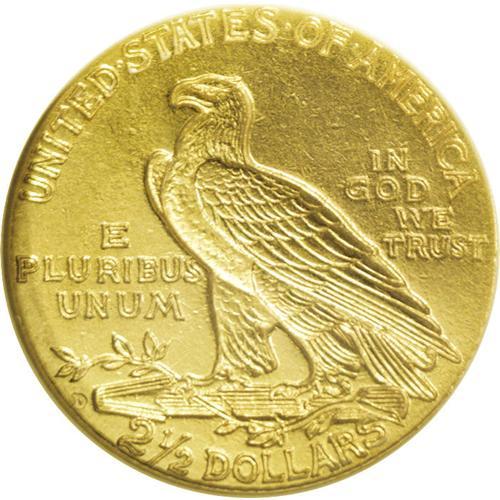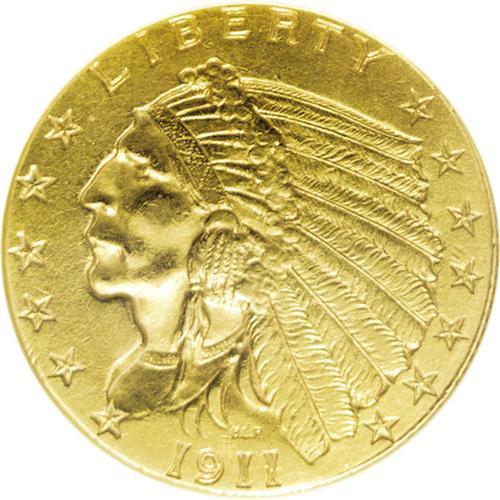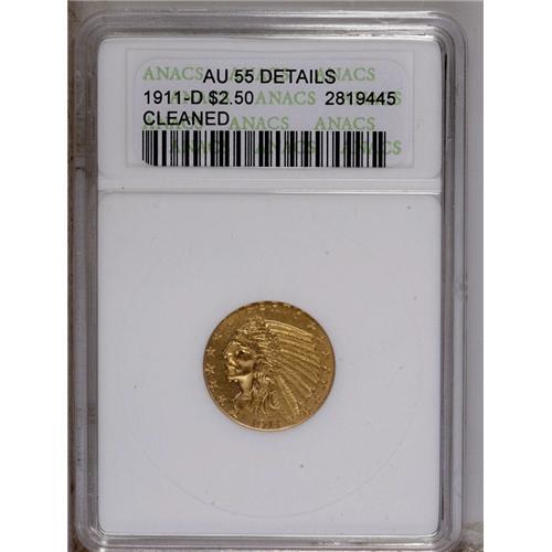 <B>1911-D $2 1/2 --Cleaned--ANACS. AU55 Details.</B></I> Peach-gold surfaces display some unnatural brightness from the cleaning, as well as wispy hairlines. Sharp definition is noted on the design elements, except for softness on the eagle's shoulder. A couple of minor abrasions are seen on the Indian's cheek. the mintmark is relatively strong for the issue. The undisputed key to the Indian quarter eagle series.